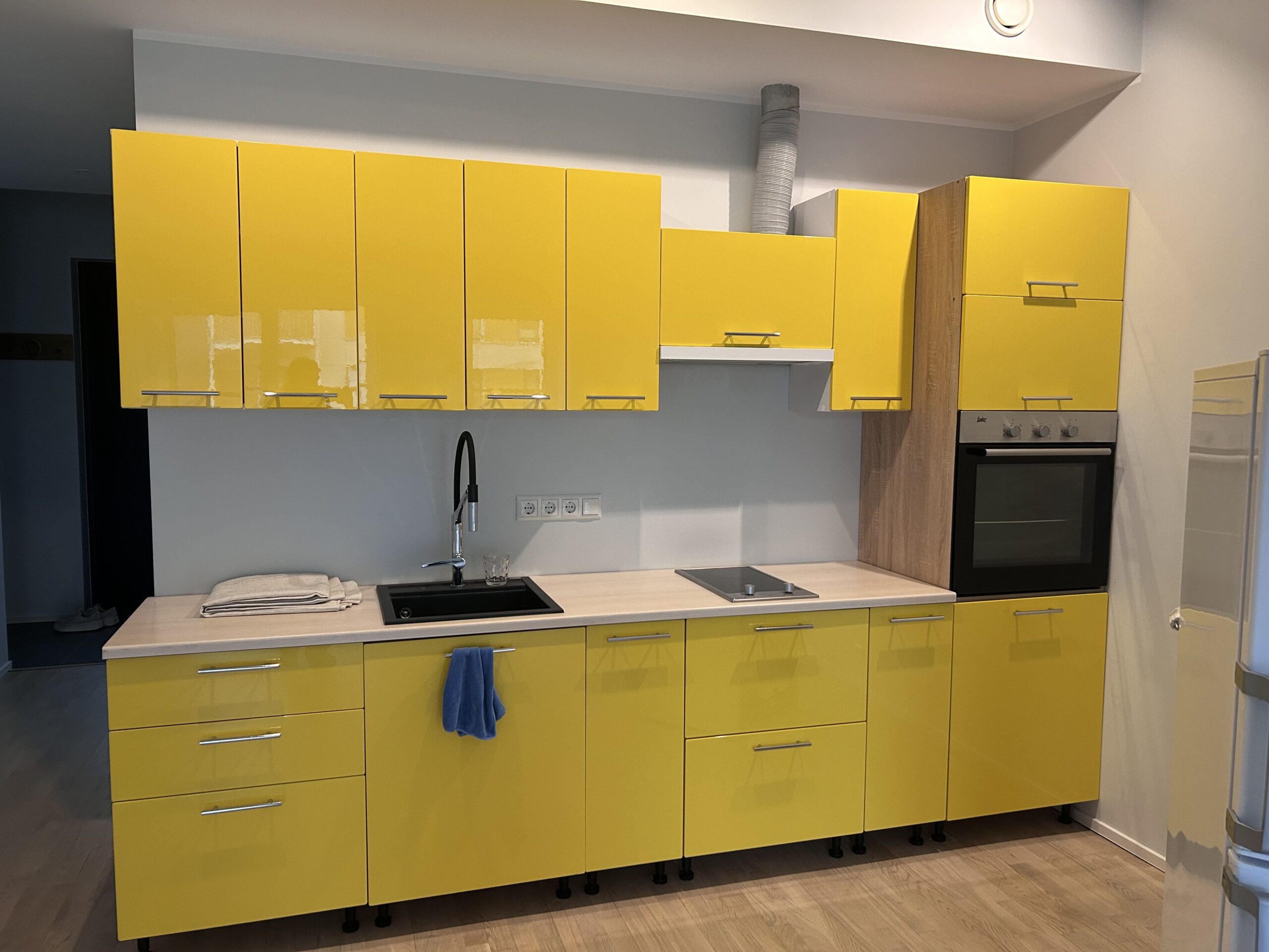 Kollased köögikapid üle kiletatud kvaliteetsete Samsungi sisustuskiledega.